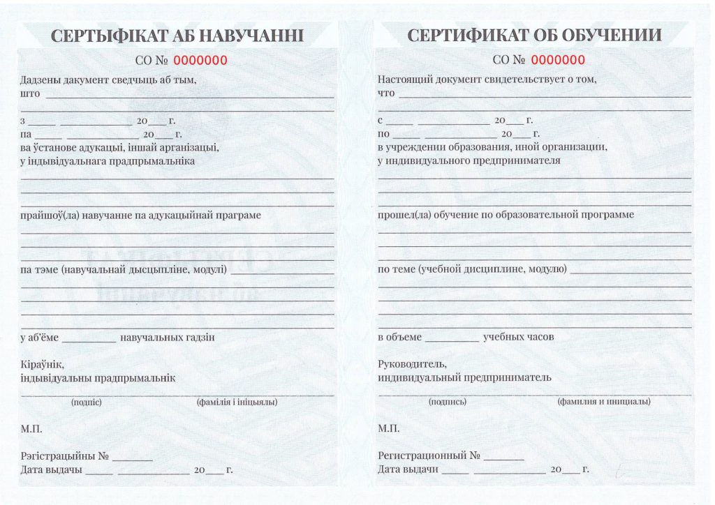 Срок получения дополнительного образования взрослых при освоении содержания образовательной программы курсов целевого назначения, а также тематика учебных занятий, наполняемость учебных групп определяется учреждением образования, осуществляющим образовательную деятельность (если иное не установлено законодательными актами). По окончании обучения слушателям выдается сертификат об обучении установленного образца (в случае принятия учреждением образования, осуществляющим образовательную деятельность, решения о его выдаче).